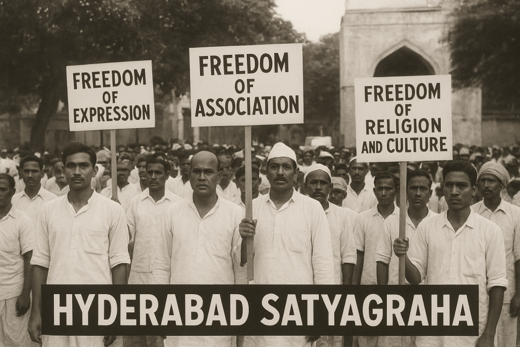 In 1938, under the absolute monarchy of the NizamMir Osman Ali Khan,the hereditary Muslim ruler of Hyderabad, civil rights were virtually non-existent. There was no freedom of association, press, or political expression, and dissent was treated as a threat to state authority. The Public Safety Order of 6 September 1938 banned the Hyderabad State Congress and prohibited public meetings, while the Hyderabad City Police Act (1348 Fasli) granted sweeping powers to restrict assemblies, patriotic songs, and cultural gatherings. Even at Osmania University, the singing of Vande Mataram was banned, and Hindu religious celebrations faced curbs and surveillance. Though these laws claimed to preserve order, they overwhelmingly targeted Hindu organisations and nationalist sympathisers. In this atmosphere of repression and religious discrimination, the idea of non-violent resistance emerged as the possible and dignified form of protest.